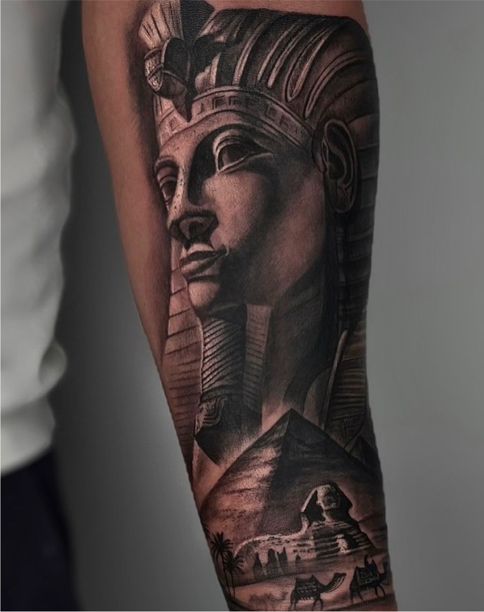 Bespoke pricing based on size, placement and design; larger work £100/hour. Typical time: sleeves 25–35h, chest 10–15h, back 35–50+h. Enquire via Bookings/Contact for a quote.